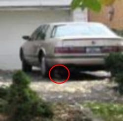 Nessa imagem, é possível ver embaixo do carro, dois olhos vermelhos e uma boca. Tentei ampliar, mas ficou uma merda, enfim, taí: